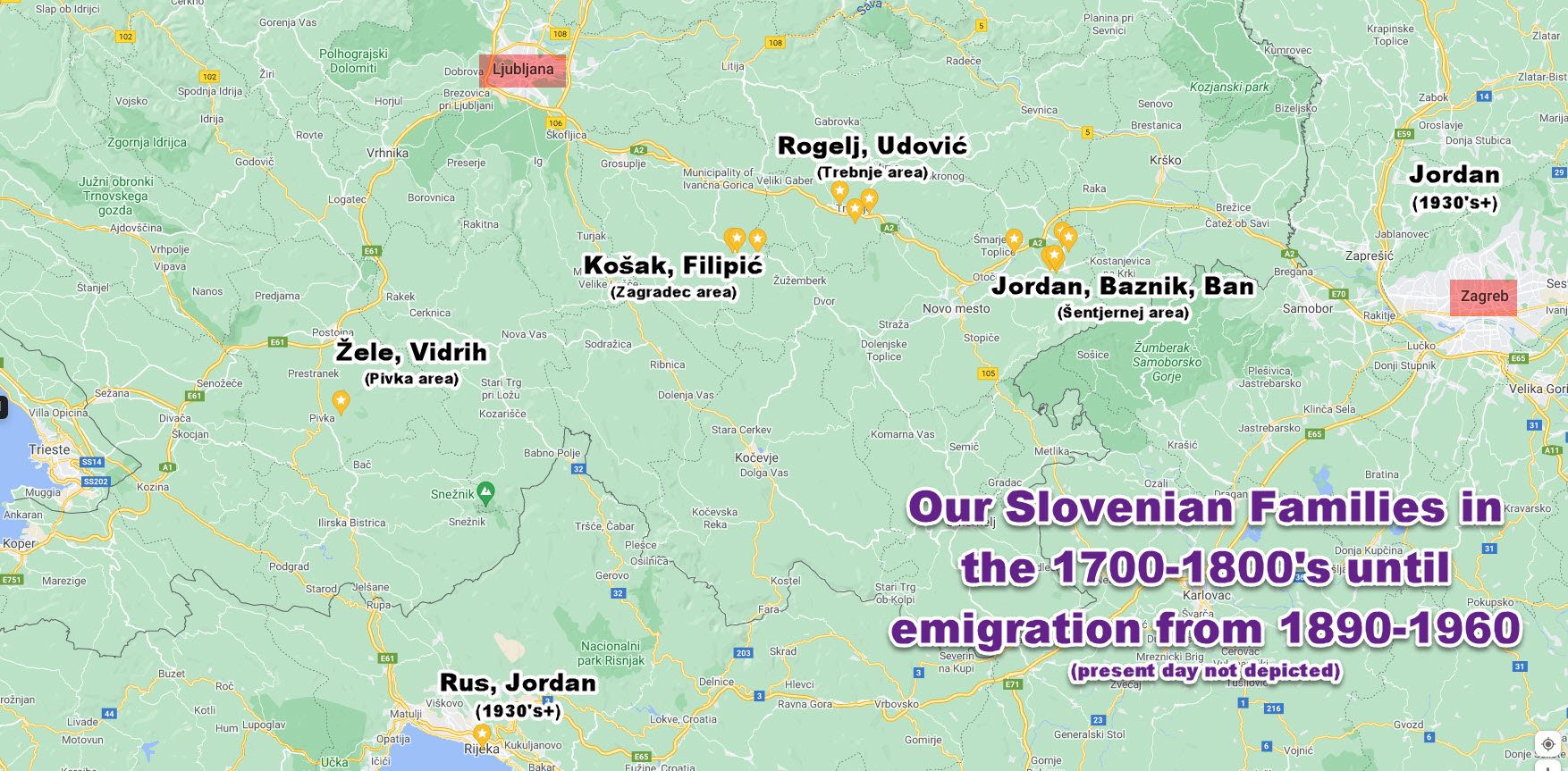 Elizabeta Jordan's line hails from Eastern Slovenia nestled between Zagreb (capital of Croatia) and Liblijuana (capital of Slovenia). Nearer Zagreb, which is down river, and the Croatian border to the south and west. The towns in Eastern Slovenia are only 10 km from the border with what is now Croatia and less than 100 km from Trieste and the Adriatic Sea. This was the known, starting point. But discoveries since then have widened the scope of interest.Šentjernej is the home of the Jordan and Baznik families and sits between two capitals. After the death of the parents, the kids were scattered to the grandmothers farm outside Šentjernej and to other relatives in Zagreb and Ljubljana. Eventually, four of the six Jordan girls were sent to America over a 6 year period. Karel and Marija sent to an Aunt in Ljubljana after which they married and settled near Rijeka and Novo Mesto as their joint business grew.