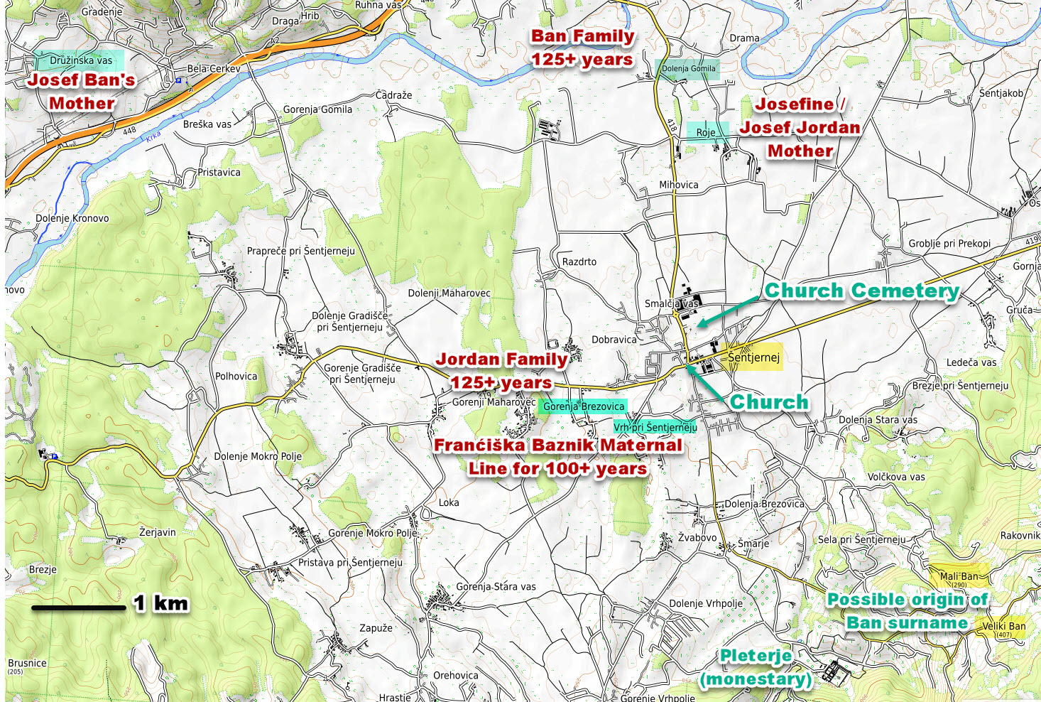 We had always been told by Elizabeth "Betty Kosak" Jordan that they were from Šentjernej. The town is fairly definable and was visited in the 1980's on the two trips with her kids. It is here where the family graves of Franciska Baznik and her mother Anna Turk and sister xxxxx are; as well now her son Karel, his wife Mela, and his son Eddo. Although Antonia Jordan declares her home town as Brevica, this name appears associated with a few villages in the area, including one within a kilometer of Šentjernej. In the close-in topo map of Šentjernej and after consulting the record books for the 17 and 1800's, we now untangle the names. The Jordans had a house in Gorenja Brecovica for over 100 years. With the mother to Josef Jordan (Anna Kuhar) coming from Roje nearby. Franćiška was born in Vrh near Šentjernej. The house that Elizabeta and a few younger ones would live in for a while with the grandmother after Franciska died. Anna Baznik nee Krhin had gotten the house from her mothers line (Anna Zonta) as the Krhin's were from Gradifhegor. Baznik's came from Loke near Krško.Trebnje